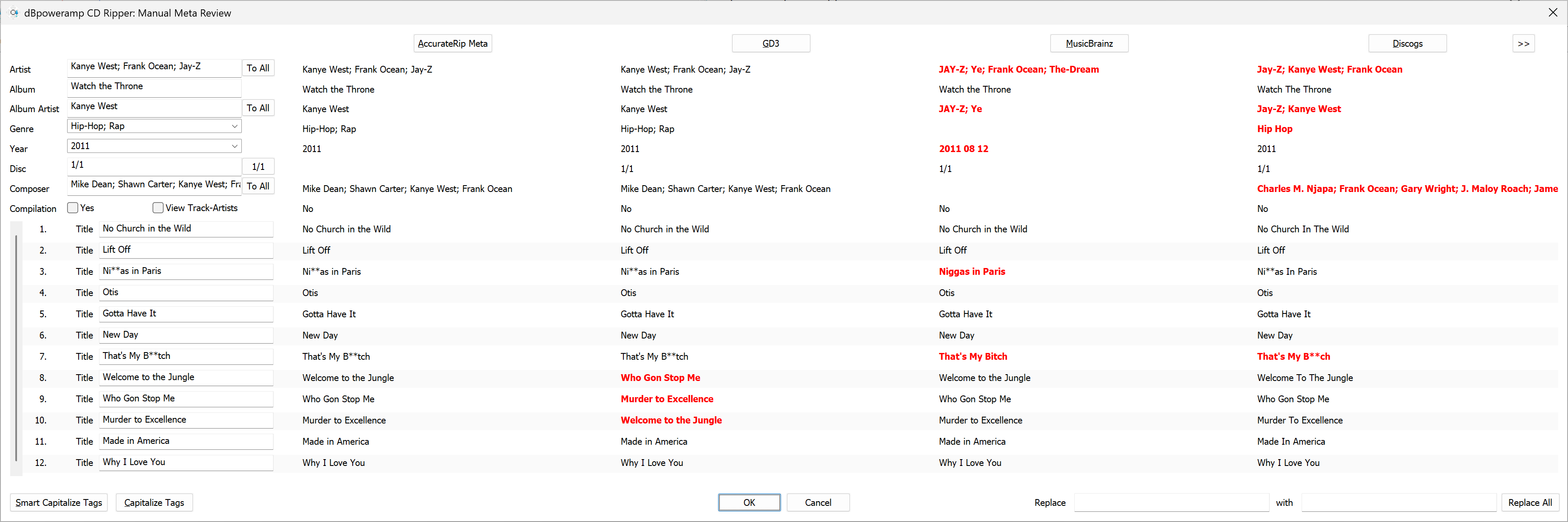 Artist and Album can be typed to be searched, using both Discogs and Musicbrainz. It is also possible to load an exact disc from either of these sites, simply browse to the disc release page on