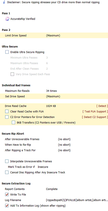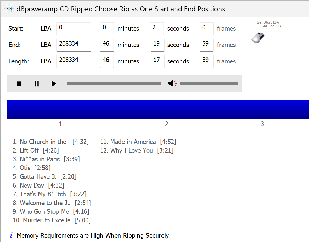 A final note if using Rip as One to rip the whole CD as one image, with secure mode on - the memory requirements are ~600MB x number of passes, so if 2 passes are done that is 1.2GB of memory required in secure mode. Burst mode has no such memory requirements.