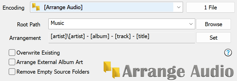 [artist]\[artist] - [title] each audio file is placed into an Artist folder, and the filename is renamed, example: Madonna\Madonna - Holiday.mp3