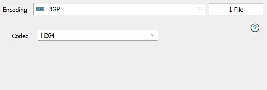 Only one option is present for this encoder, codec choice of H263 or H264. H263 offers only limited resolutions, audio is encoded as amr. AAC audio encoding is used with the H264 encoder.